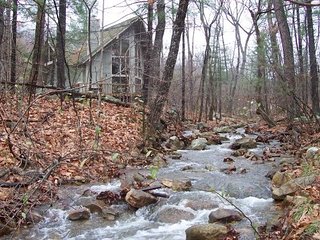 This cabin, which we call Oakwood, is located alongside a babbling mountain stream. The covered deck in the rear overlooks the stream, and the picnic table, charcoal grill, and fire ring beside it. The front opens up to a grassy area. Oakwood is just a couple miles from the Blue Ridge Parkway, and is conveniently located to lots of outdoor activities, including hiking, fishing, canoeing, and kayaking. It is close to the Skyline Drive and Shenandoah National Park. Wintergreen Ski Resort is nearby, as is Sherando Lake, part of the George Washington National Forest.