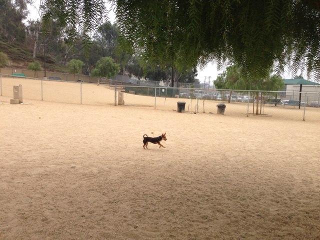 Your pet will love the off-leash play at this fenced hillside dog park with separate small dog area, sand and gravel ground cover, benches, and shade.