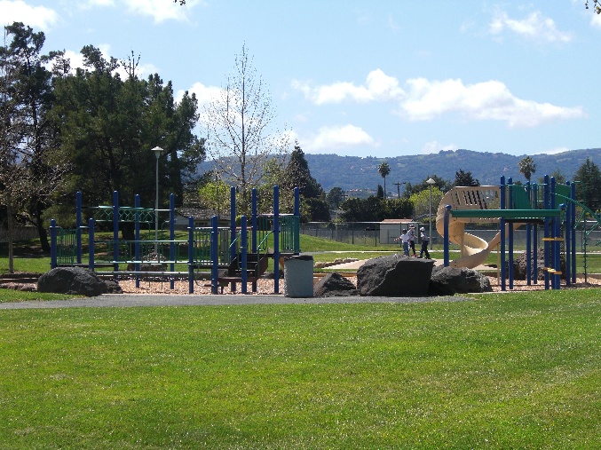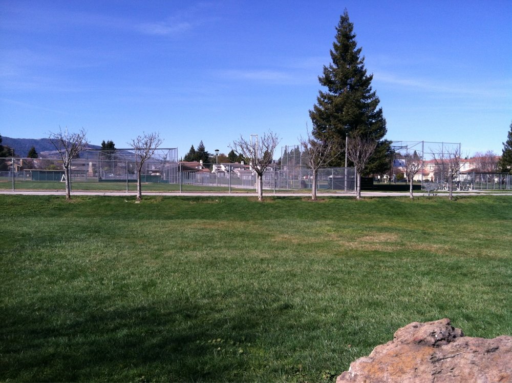 Leashed pets are welcome at this Cupertino public park with grassy areas and a baseball field.