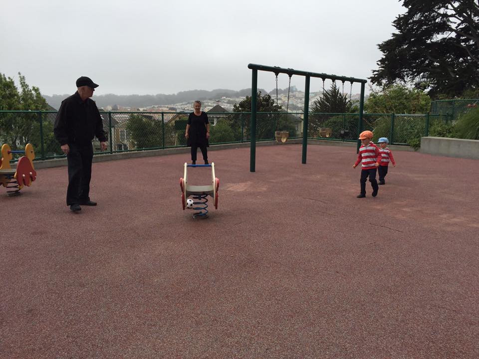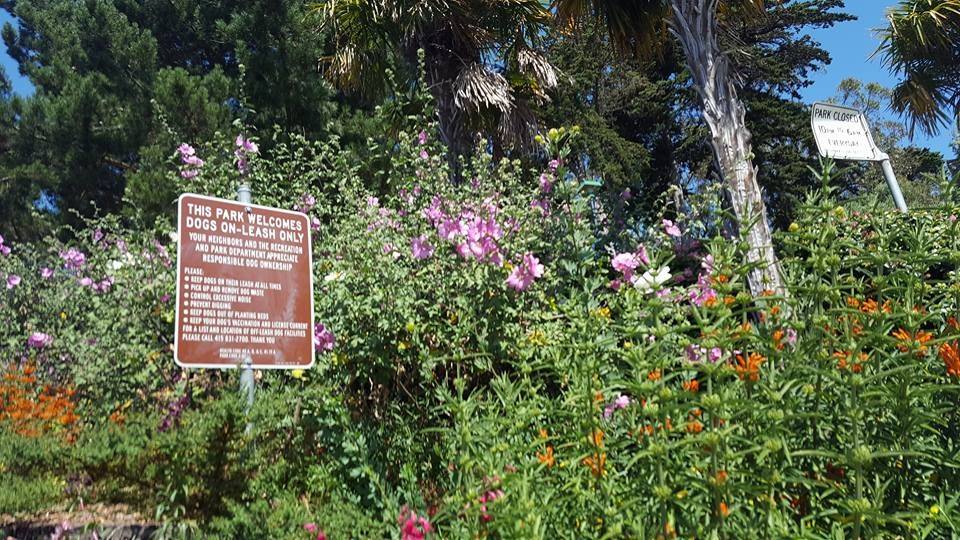 This beautiful little park in Bernal Heights is SF's best kept secret. It's a great place for dogs to play with other dogs or play catch with their human. It's also a great place for dog lovers to meet other dog lovers. Posted signs say on-leash only, but most folks let their dogs run free. The beauty of this park is that owners pick up after their dogs, and maybe because it is a small park and owners are close by, dogs are remarkably friendly toward other dogs and people. The park is mostly grass with walkways and lots of trees. There is a baseball diamond (fenced-in) at the top of the hill, two fenced-in kiddie playgrounds and fenced-in barbecue areas.