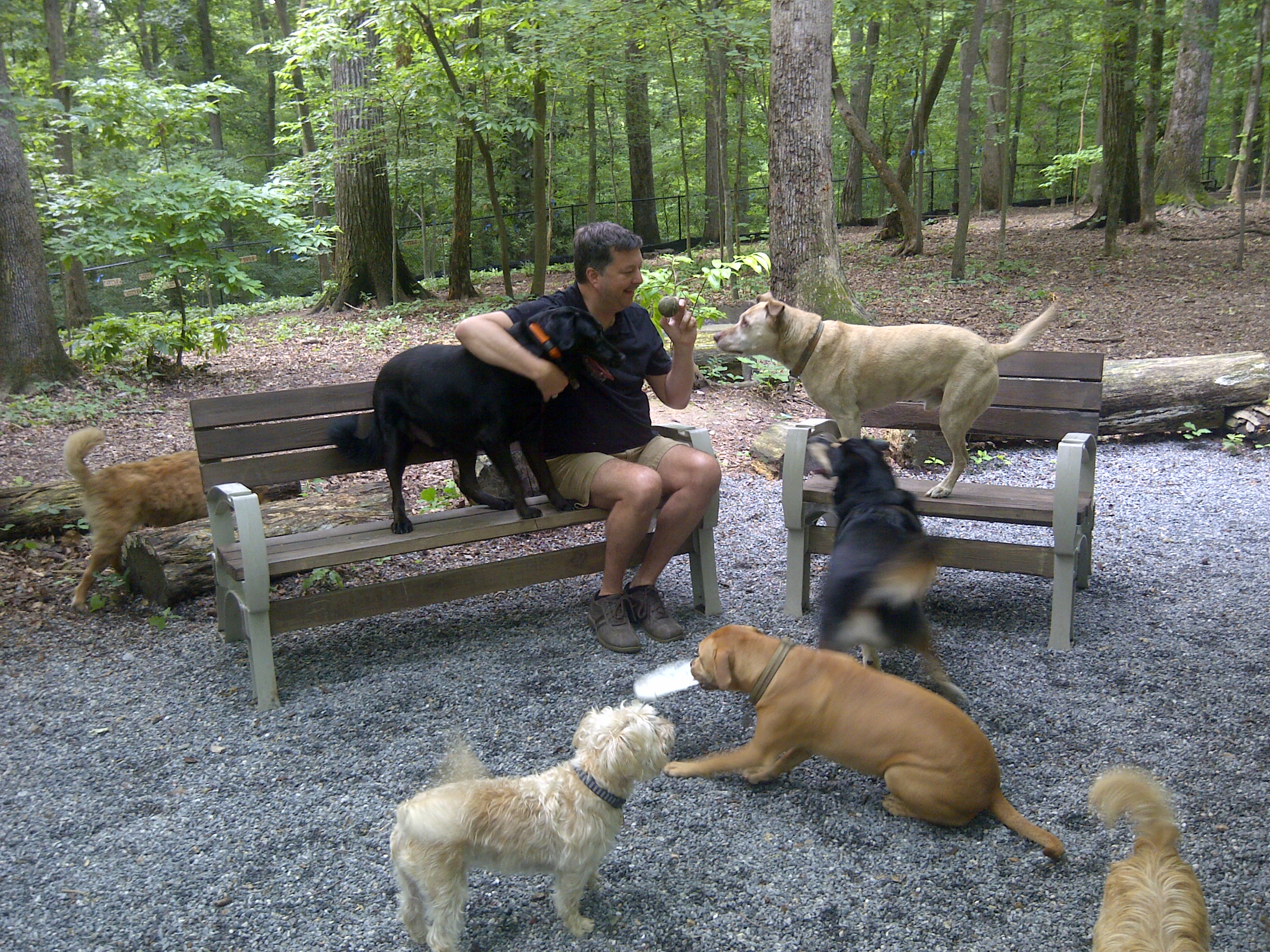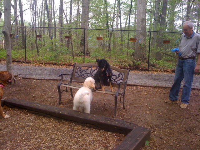 The Brook Run Dog Park is four acres, fully-wooded and fully-fenced. One loop around the park's fence line is 1/3 of a mile. There are multiple seating areas throughout as well as water stations and poop stations. This is a public park, so it's free. The dog park is open from sunrise til sunset. Large parking lot adjacent. There is NO separate section for small dogs yet, but four acres offers a lot of room to find a quiet spot. The park is maintained by a large, all-volunteer, non-profit organization that continually works to improve the facility, so please do your part to pick up after your dog. For more information, visit our website: www.brookrundogpark.com, or visit us on Facebook.