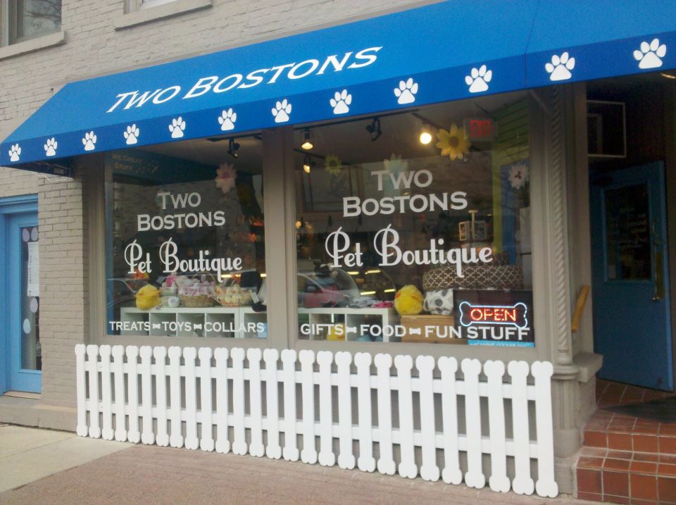 Two Bostons sells gourmet doggie treats, a variety of dog and cat foods that other retailers don't carry, high fashion clothing, toys for cats and dogs, and anything else you may want with a fashionable twist.