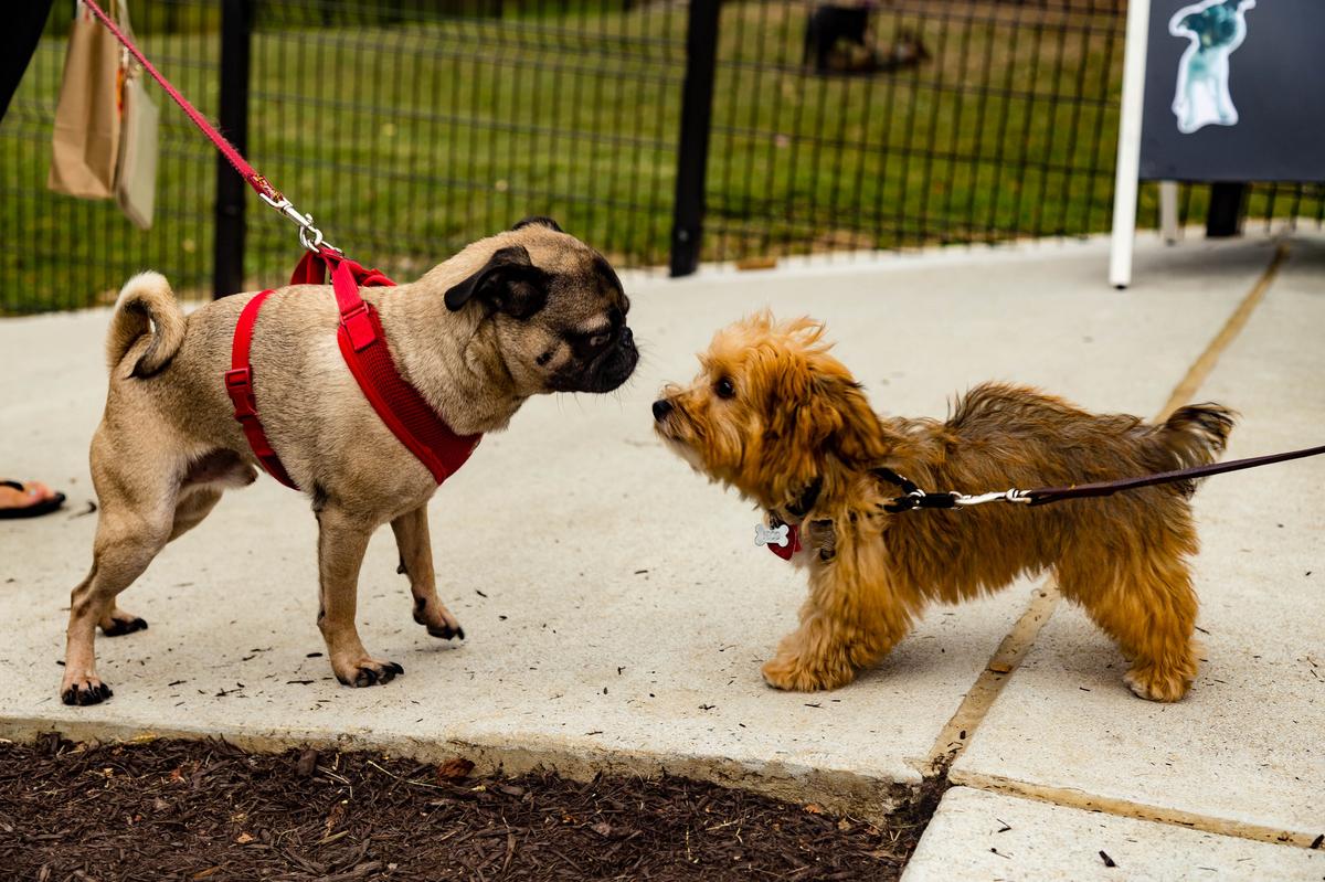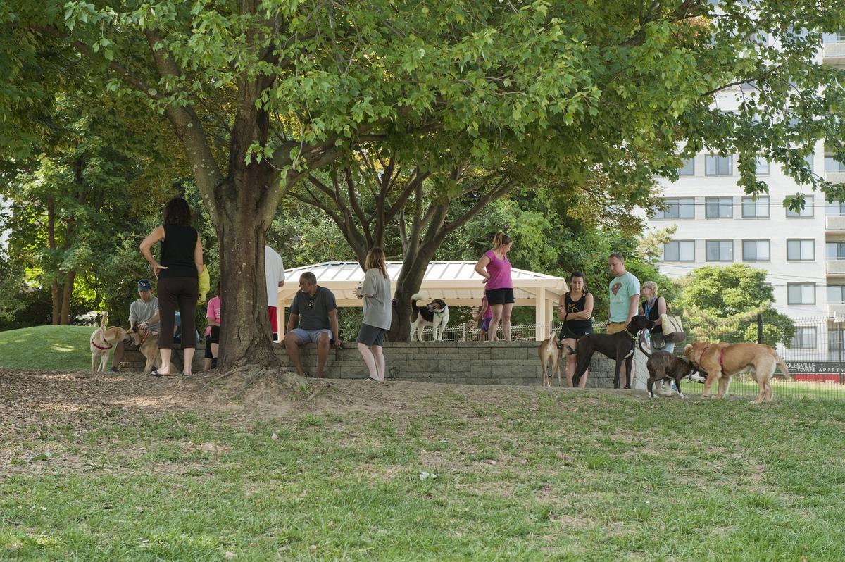 Ellsworth Urban Dog Park consists of two separate, fully enclosed and ADA-compliant exercise areas: a small dog area (approximately 2,800 square feet) intended for dogs under 20 pounds, and a large dog area (approximately 17,000 square feet) intended for healthy, well-socialized dogs over 20 pounds. Each enclosure includes a drinking fountain, hose bib or quick coupler connection, artificial turf play mound, benches, shared shade structure, trash receptacles, and a variety of surfacing materials. Open daily from sunrise to sunset.