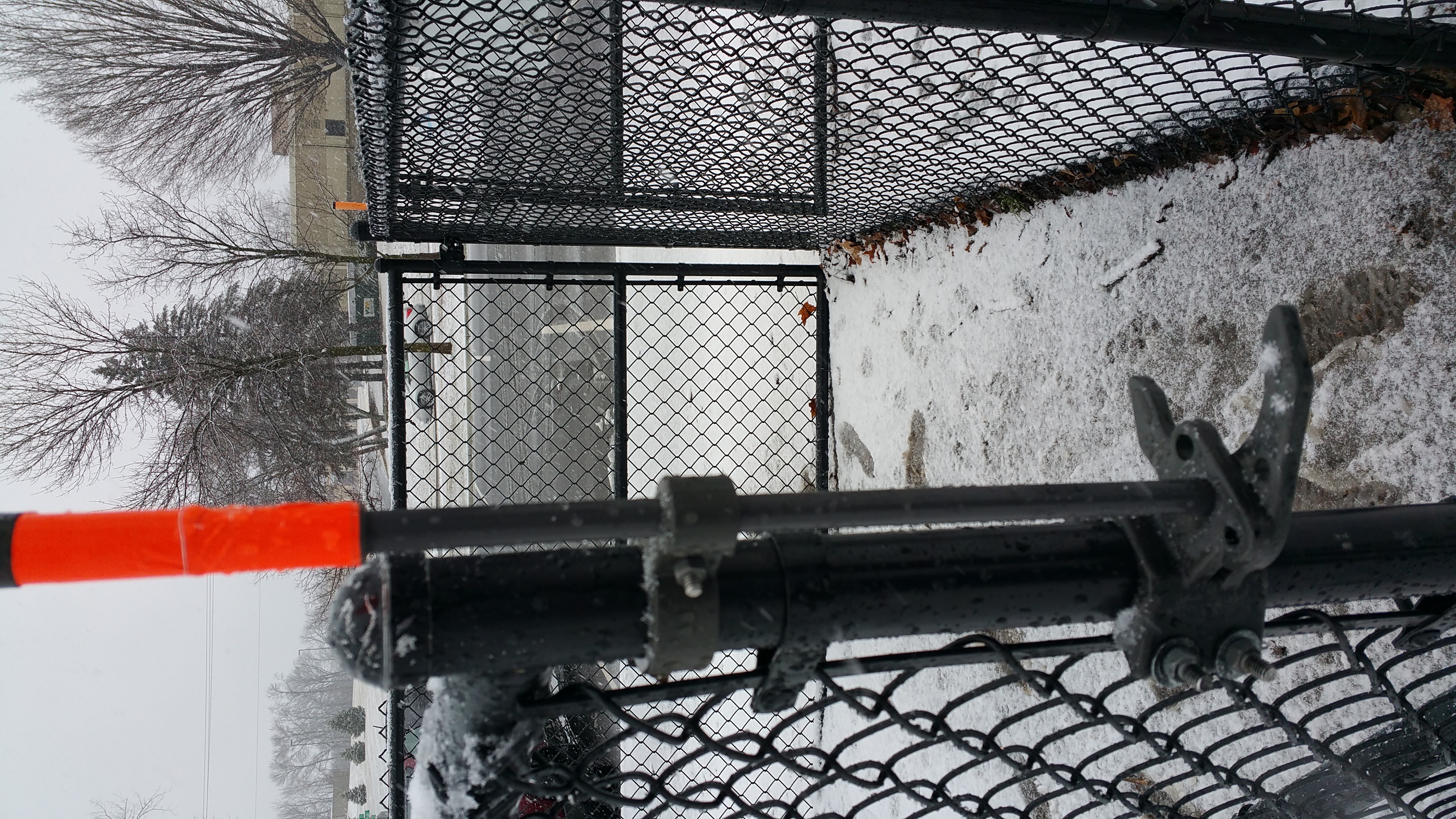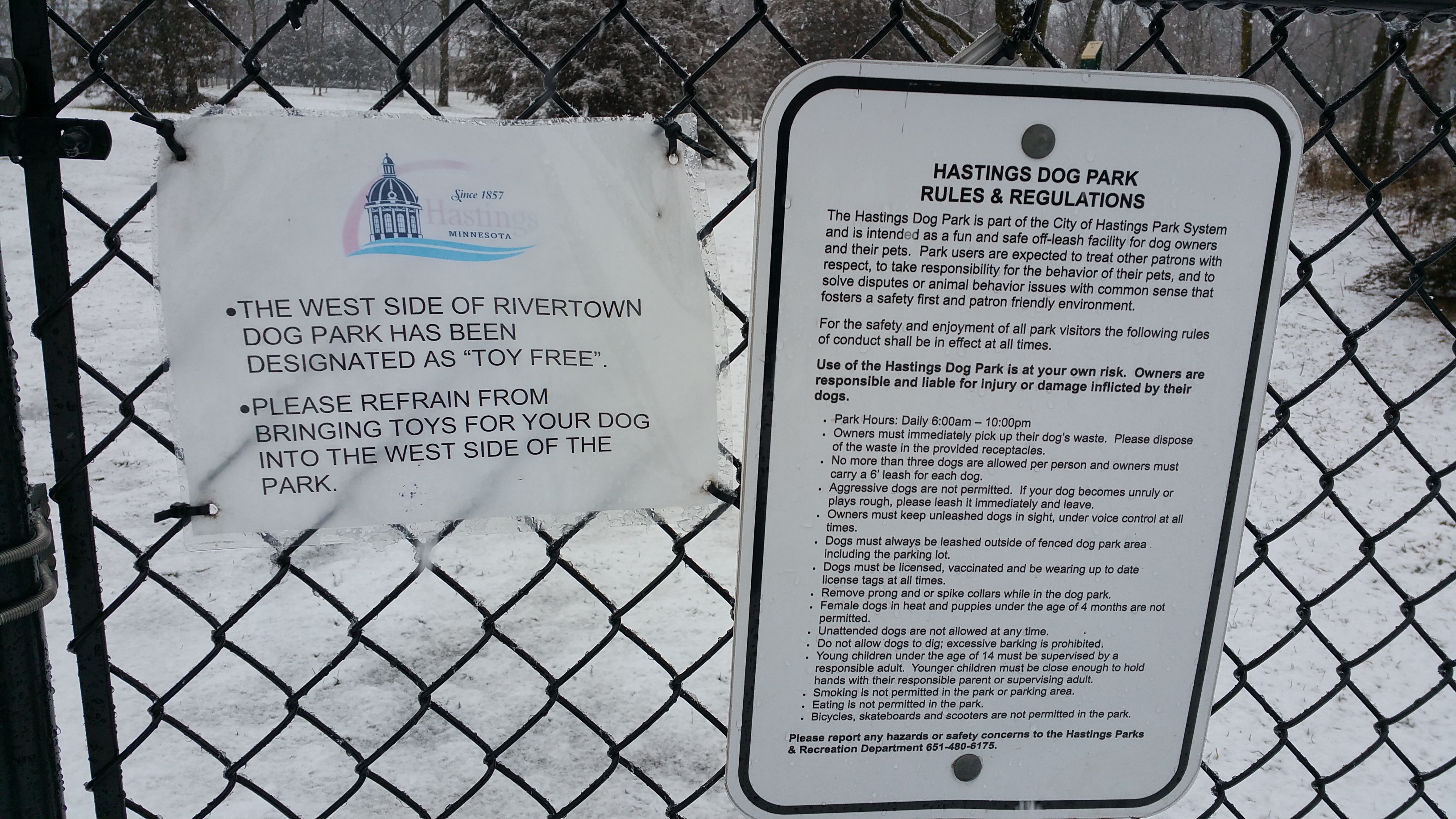 Fenced in three area park with trees. One fence is toy friendly (can play with a chuckit easily), one is not toy friendly and one was small/timid dog. There is a nice paved parking lot and dog waste bags available. Waste receptacles are two trash bins outside the front gate. It is a great place to hang out with your dog off leash inside the fences.