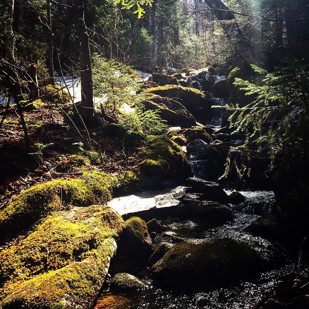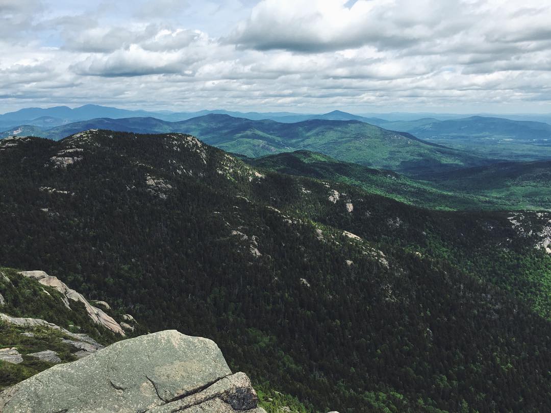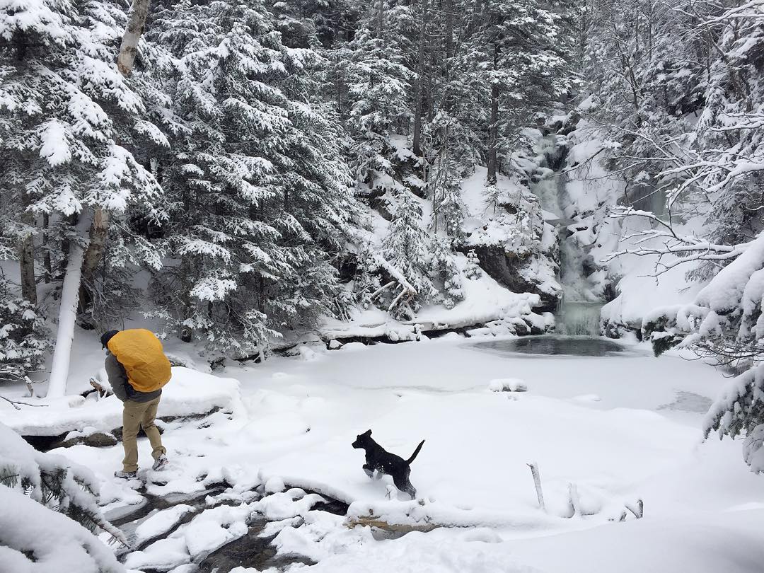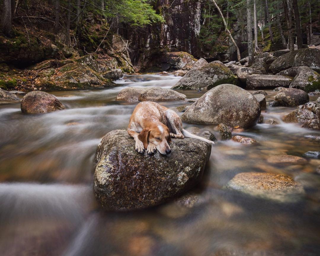Kancamagus Highway from Lincoln to Conway NH runs through the White Mountain National Forest and allows dogs on leash and under voice command on the hiking trails. Dogs also allowed at Franconia State Park under control, but not in campgrounds.