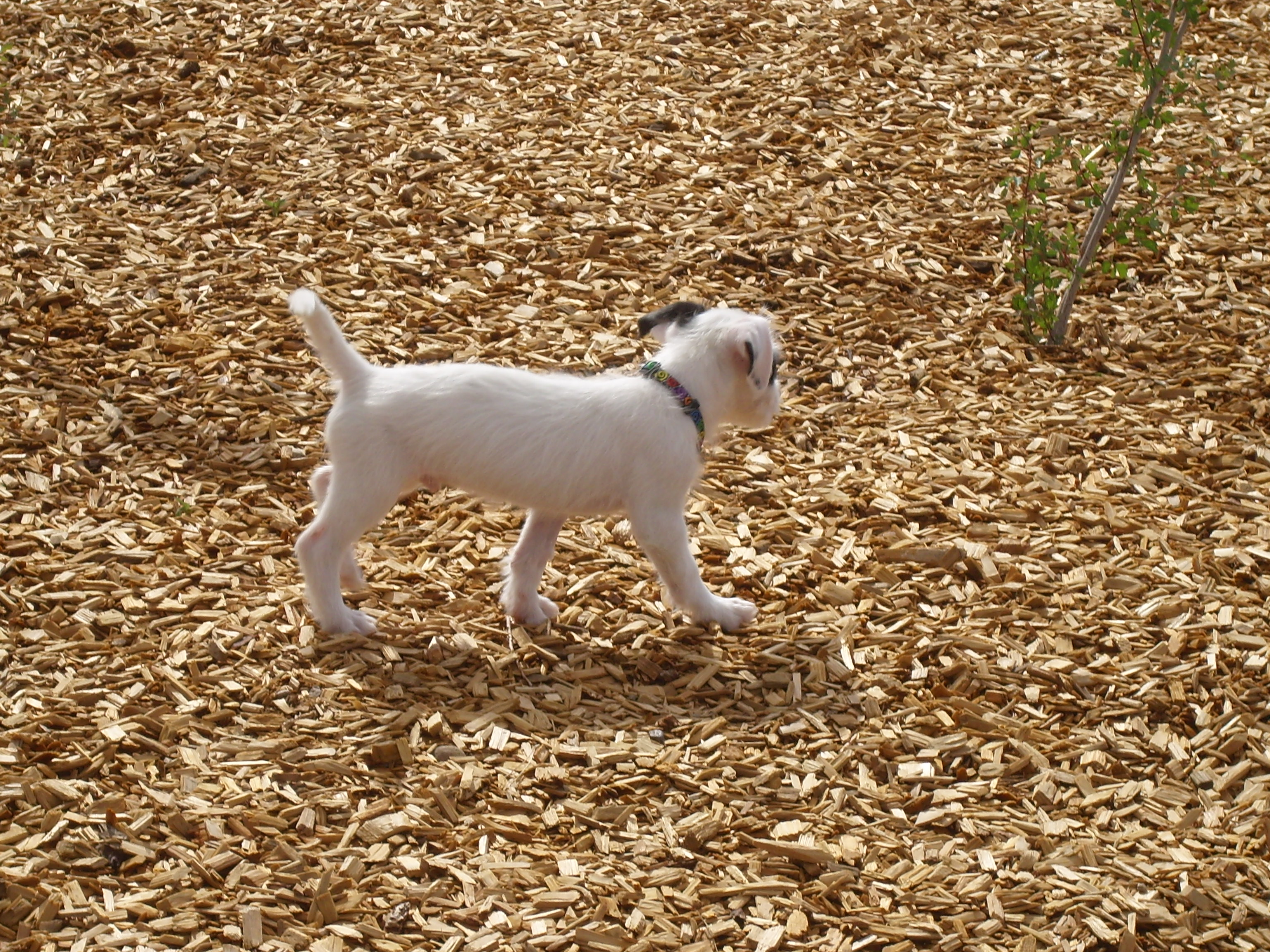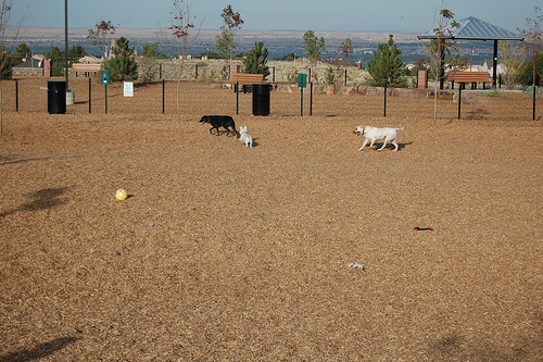 Spacious park with separate large and small dog areas, plus wood chip ground cover, trees, awnings, benches, and lighting.