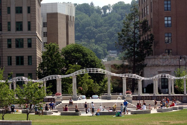 Explore the more than 6 acres of Pack Square Park with Fido by your side. This stunning public park has a large open green space, three water features, original art by regional artists, native trees and greenery, ample seating, a veteran's memorial, and public restrooms. Just remember to keep your pup on a leash and clean up after him.