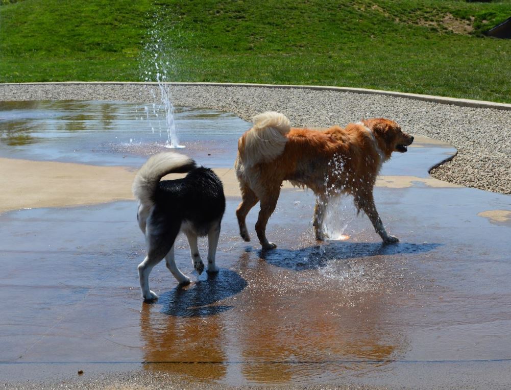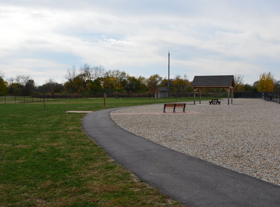 This fenced park has separate areas for large and small dogs, exercise tunnels, "sprinkle area" for drinking and washing, pathways, benches, and shaded areas.