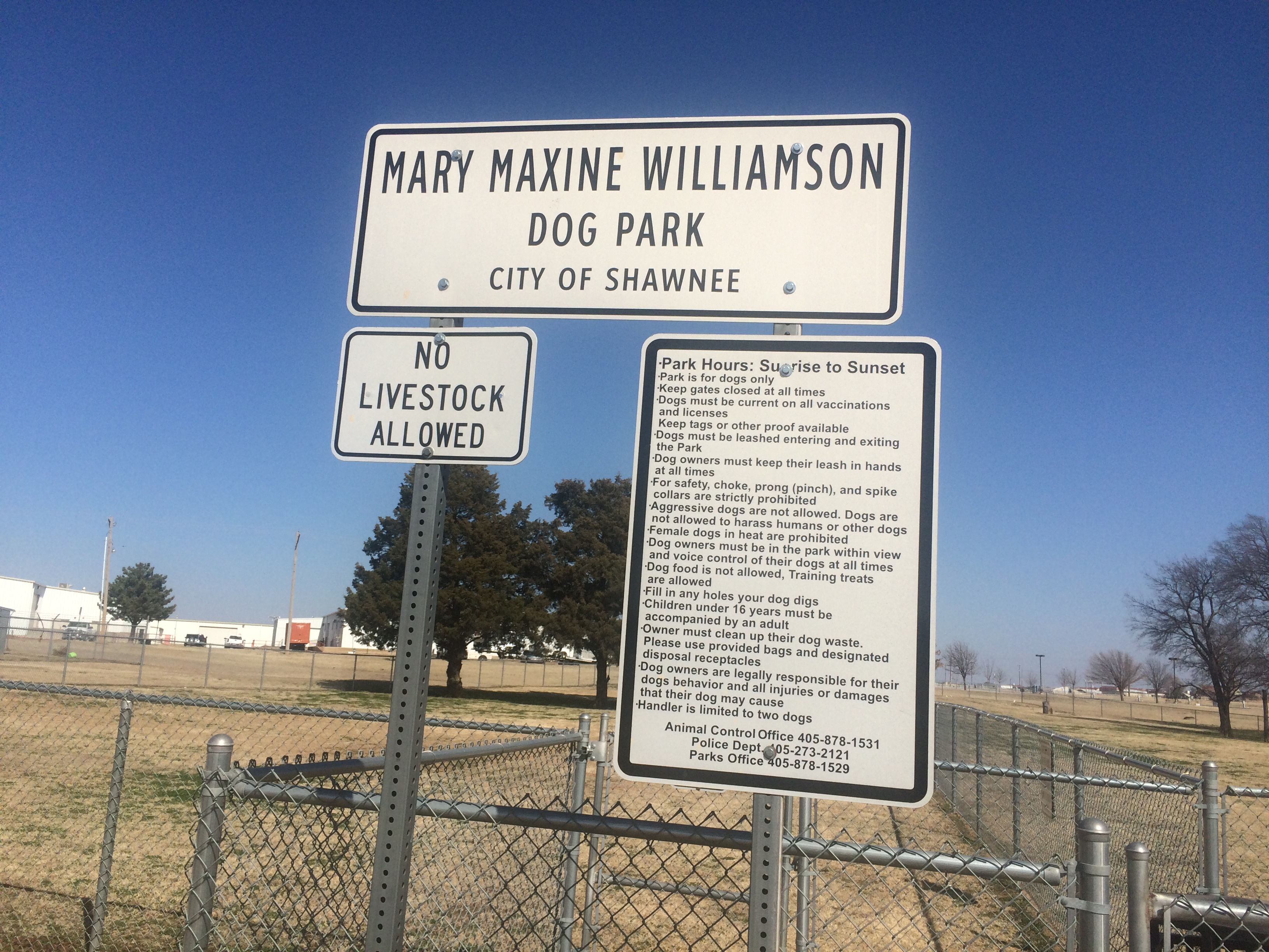 This dog park is maintained by the City of Shawnee. It is located behind the city's animal welfare center, just off of US Hwy 177 (Leo St.).There are two large runs, one for small dogs and the other for large dogs.