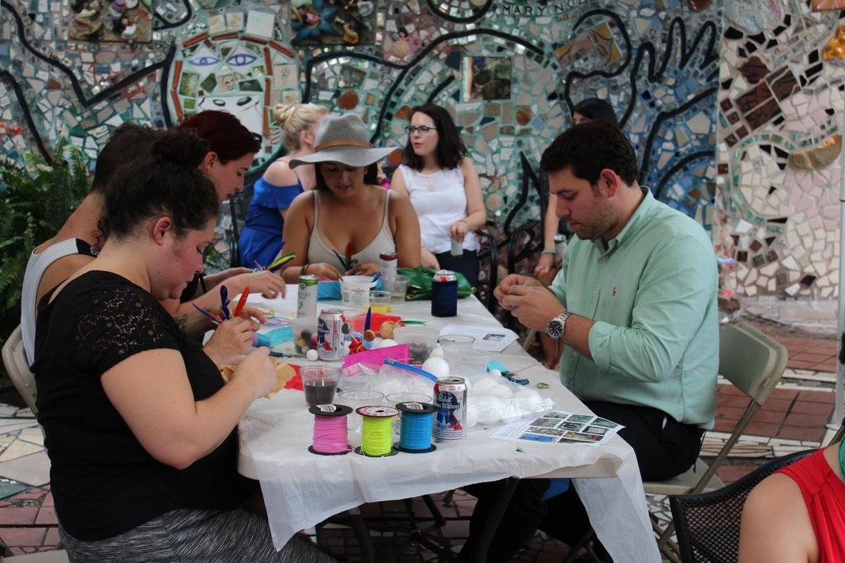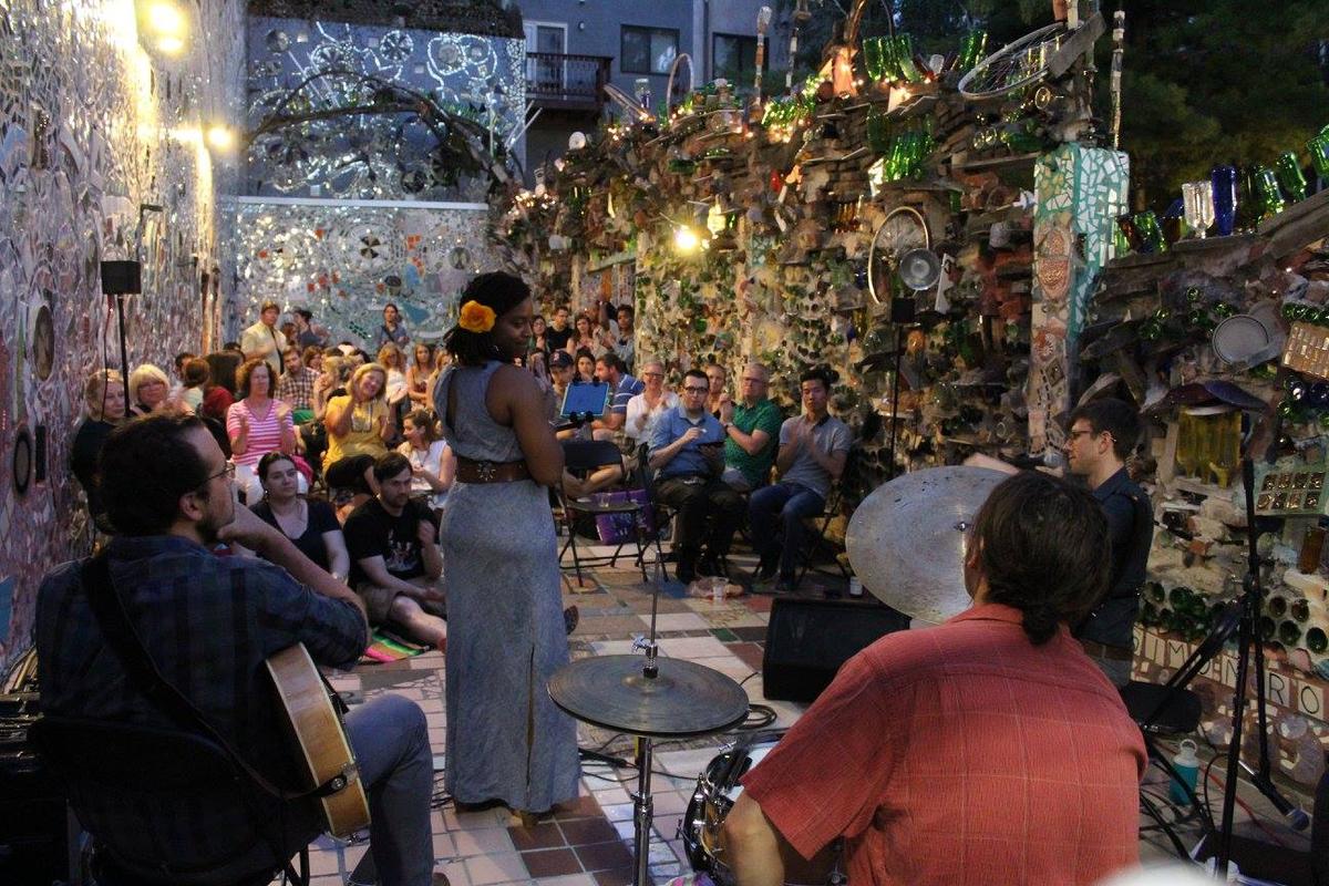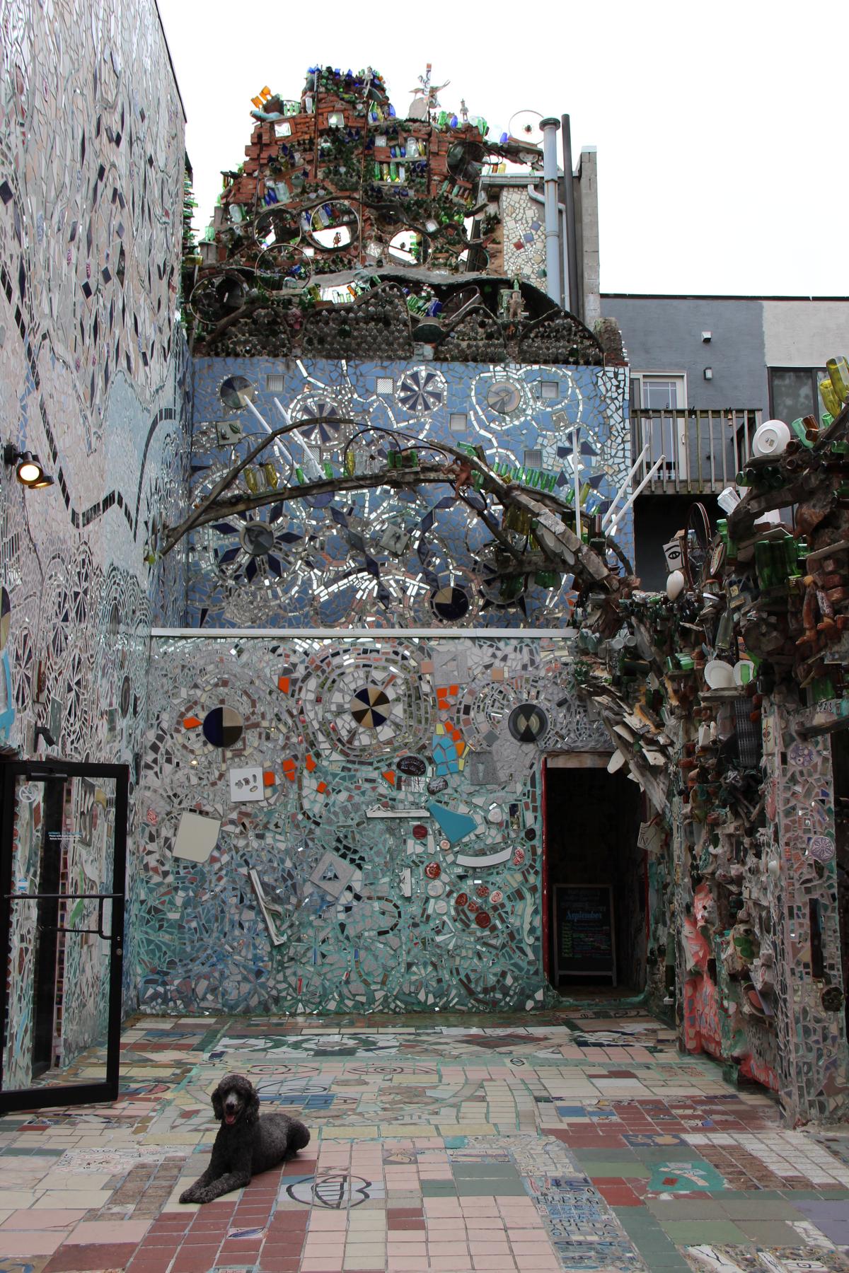 Philadelphia's Magic Gardens (PMG) is a visionary art environment, gallery, and community arts center that preserves, interprets, and provides access to Isaiah Zagar's unique mosaic art environment and his public murals. The Magic Gardens site, Zagar's largest artwork, includes a fully-tiled indoor space and a massive outdoor mosaic sculpture garden that spans half a block on Philadelphia's famous South Street. Inside, visitors can view folk art statues, bicycle wheels, colorful glass bottles, Zagar's hand-made tiles, and thousands of glittering mirrors. The installation pays tribute to Zagar's artistic influences, along with community and personal experiences.