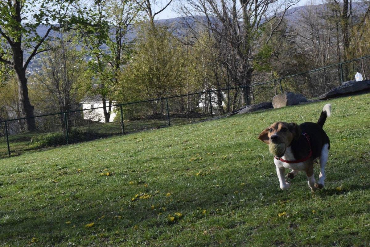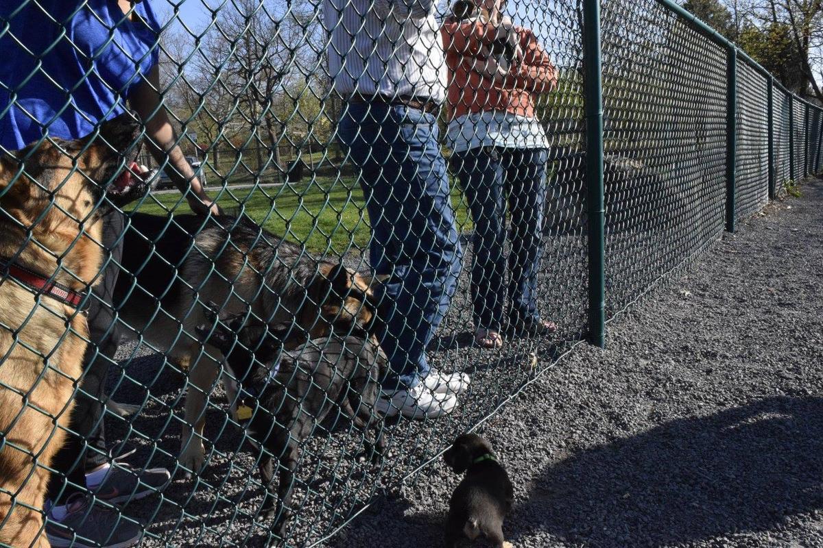 Connell Dog Park is a fenced grassy area with trees. There is also a separate section for small dogs.