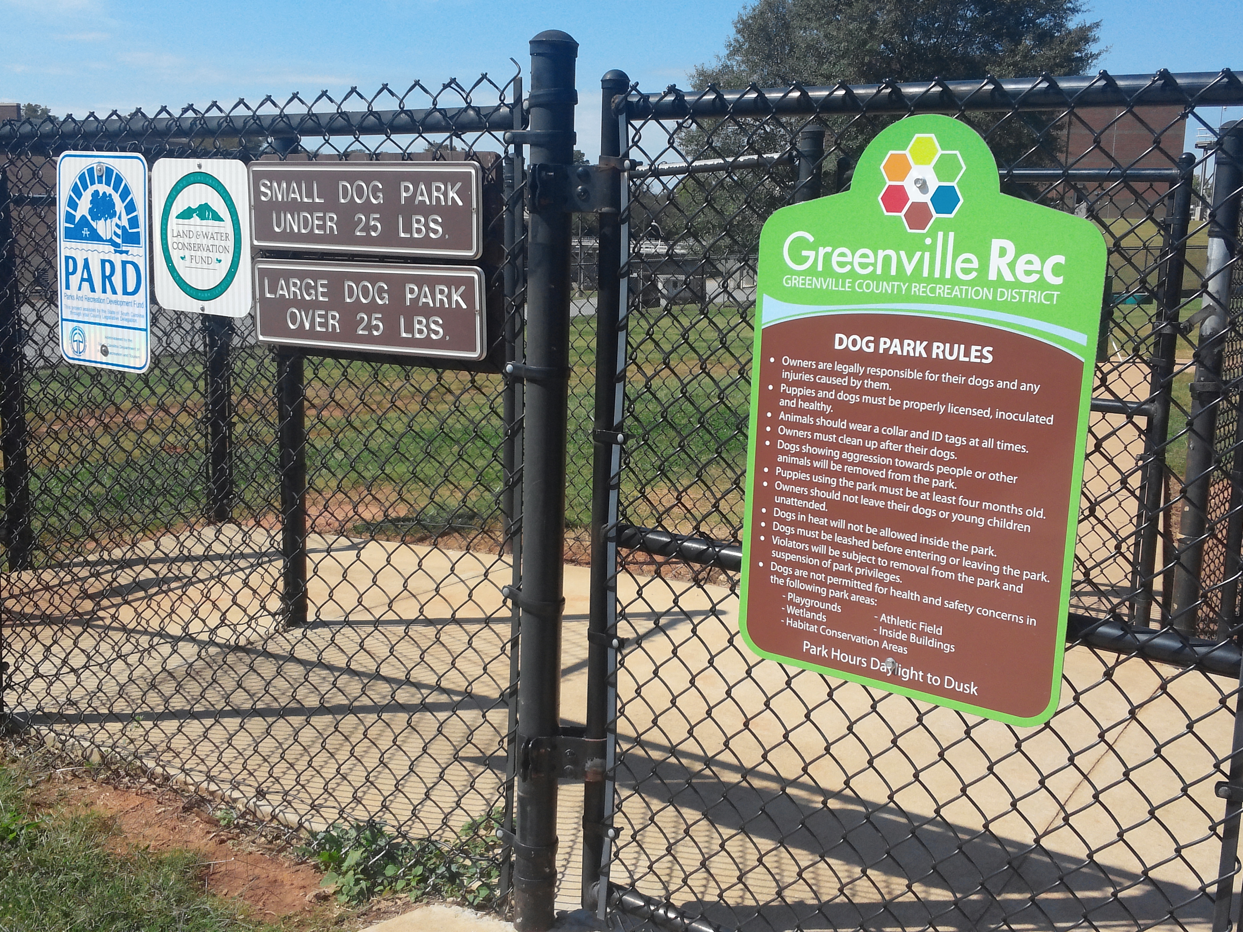 Dog Park located off Hwy 14 at the old Pelham Mills and ReWa WWTF. Includes Large and Small Dog Area, Benches, Water Station, Dog Play Features, Sand Run