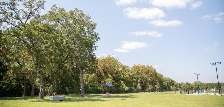 Rush Creek Dog Park is a gated community park with separate areas for large and small dogs. Rush Creek features 5.3 acres of fenced paddocks, benches, shaded areas, water fountains, two parking lots, and lighting. Dog owners are allowed three dogs per visit, must clean up after their pets, and must keep their pet on a leash until they are inside the double-gated entry. Rush Creek Dog Park is open from 5am to 10pm. It is closed on Wednesdays until 12pm for maintenance.