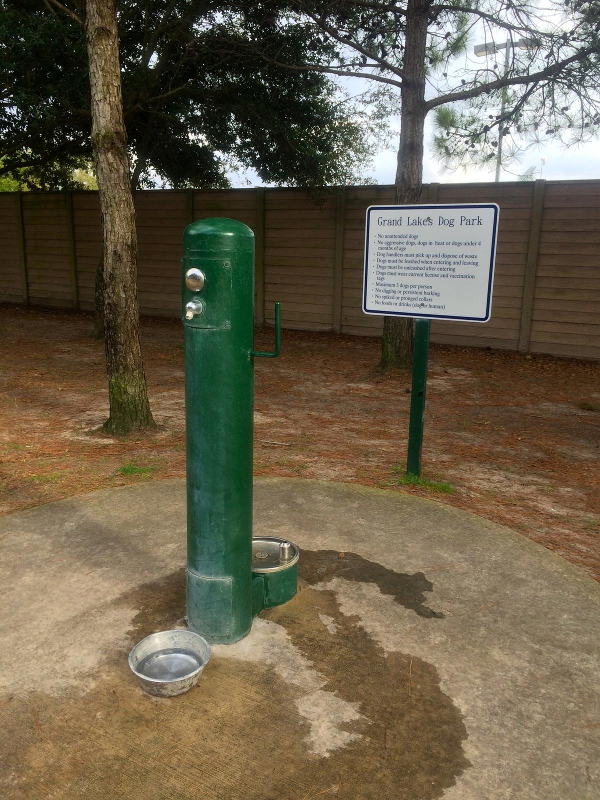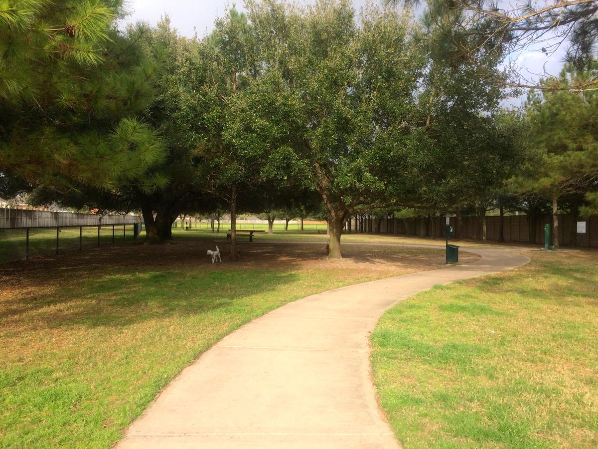 Nice neighborhood fenced dog park. There is plenty of room to roam. There is shade and sun areas. There is a picnic table area and a paved walking trail. There is a large water faucet and dog bowl.